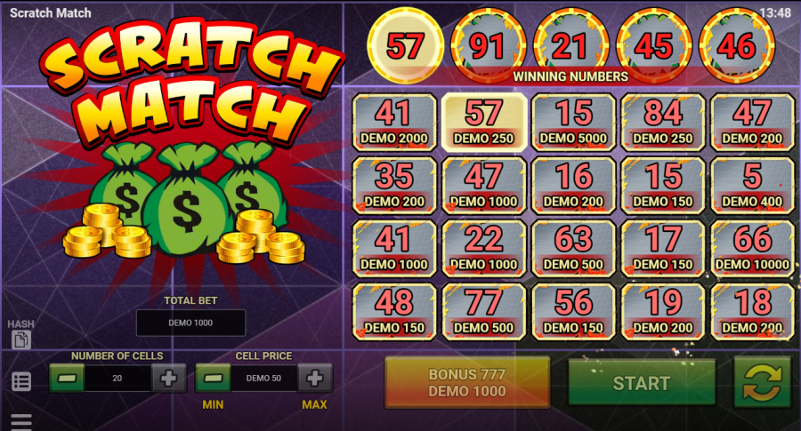Scratch Match เกมลุ้นโบนัสจากค่าย Evoplay ผู้เล่นจะต้องทำการจับคู่ไอเท็มหรือสัญลักษณ์ที่เหมือนกันกับตัวเลข 5 ตัวเลขด้านบน รูปแบบเกมจะเหมือนกับเกมบิงโกให้ลุ้นรางวัลมากมายตั้งแต่จำนวนน้อยไปถึงมากสุด 50000 บาท โดยสามารถจับคู่ในแนวตั้งหรือแนวนอน และสามารถทำการเชื่อมต่อไอเท็มได้แค่ 4 ด้านเท่านั้น ตัวเกมมีรูปแบบหลากหลายและระดับความยากที่สูงขึ้นเมื่อผู้เล่นเลื่อนขั้นต่อไป เป็นเกมที่มีกราฟิกสีสันสดใสและมีเอฟเฟกต์เสียงที่น่าสนใจ เกมนี้เหมาะสำหรับผู้เล่นทุกวัยที่ชื่นชอบเกมเรียงลอยและต้องการทดลองความสามารถในการเชื่อมต่อไอเท็มเพื่อได้คะแนนสูงสุด สามารถเข้าทดลองเล่นผ่าน Demo Evoplay กับทางเว็บของเรา Richgaming ได้แบบฟรีๆ
